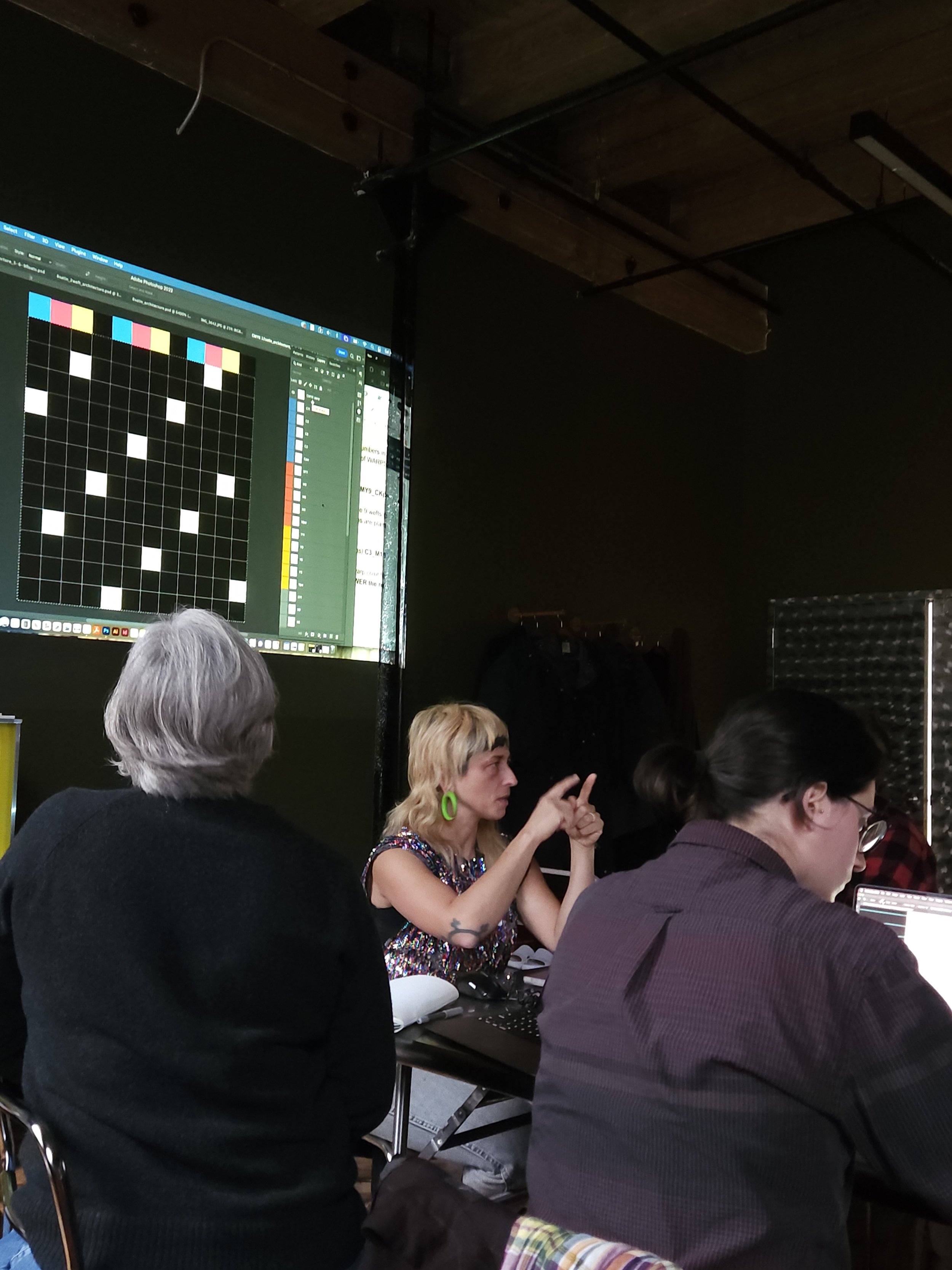 Registrations for both workshops included group weaving time slots for attendees to familiarize themselves with the TC2 looms, get authorized for independent rentals, and to test weave a small sample file designed using tools presented from Saturday’s workshop. Attendees were invited to design their own file and drop it in a shared folder by Sunday morning for LMRM to combine into a composite file. They signed up for 10 minute weaving slots as each attendee wove a portion of the composite file of everyone’s samples.