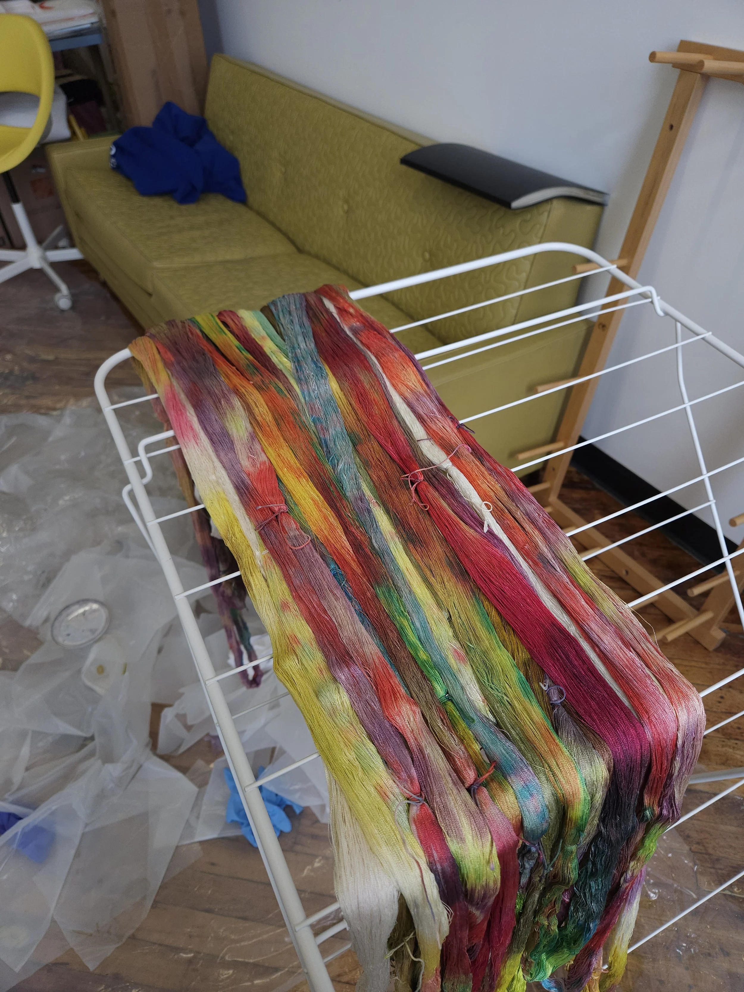 Together, the class addressed snapped threads, tangles created from the dye wash out process, and kept 20 yards of 3,520 total threads organized in the process.