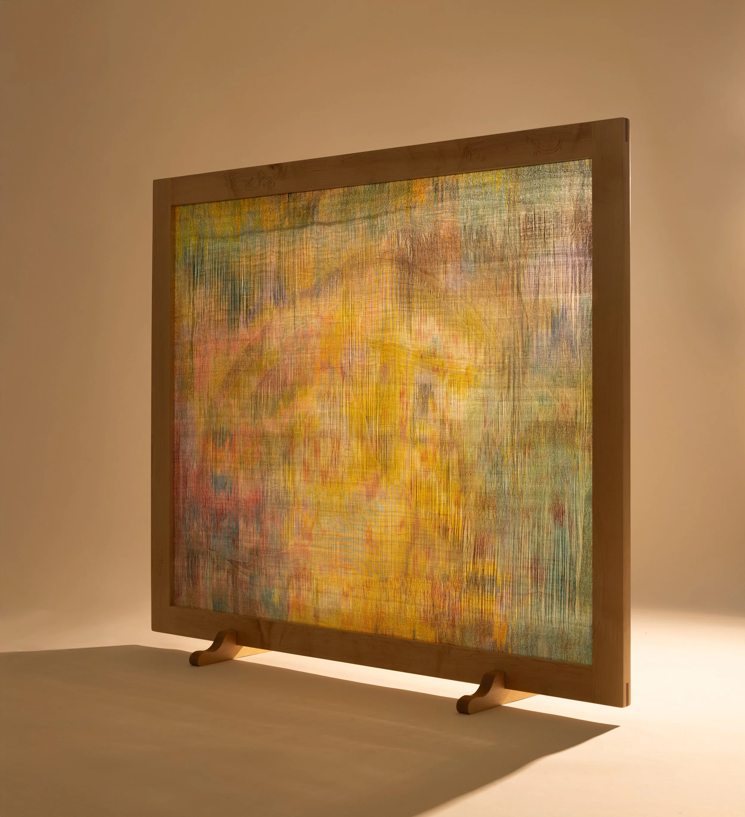 Taking inspiration from Chinese privacy screens, this freestanding frame creates much needed stability for the ethereal, unwoven aspects of the piece, performing both as a decorative partition and protection from wind or unwanted energy. Frame designed and produced by fine art woodworker Shawn Lucas.